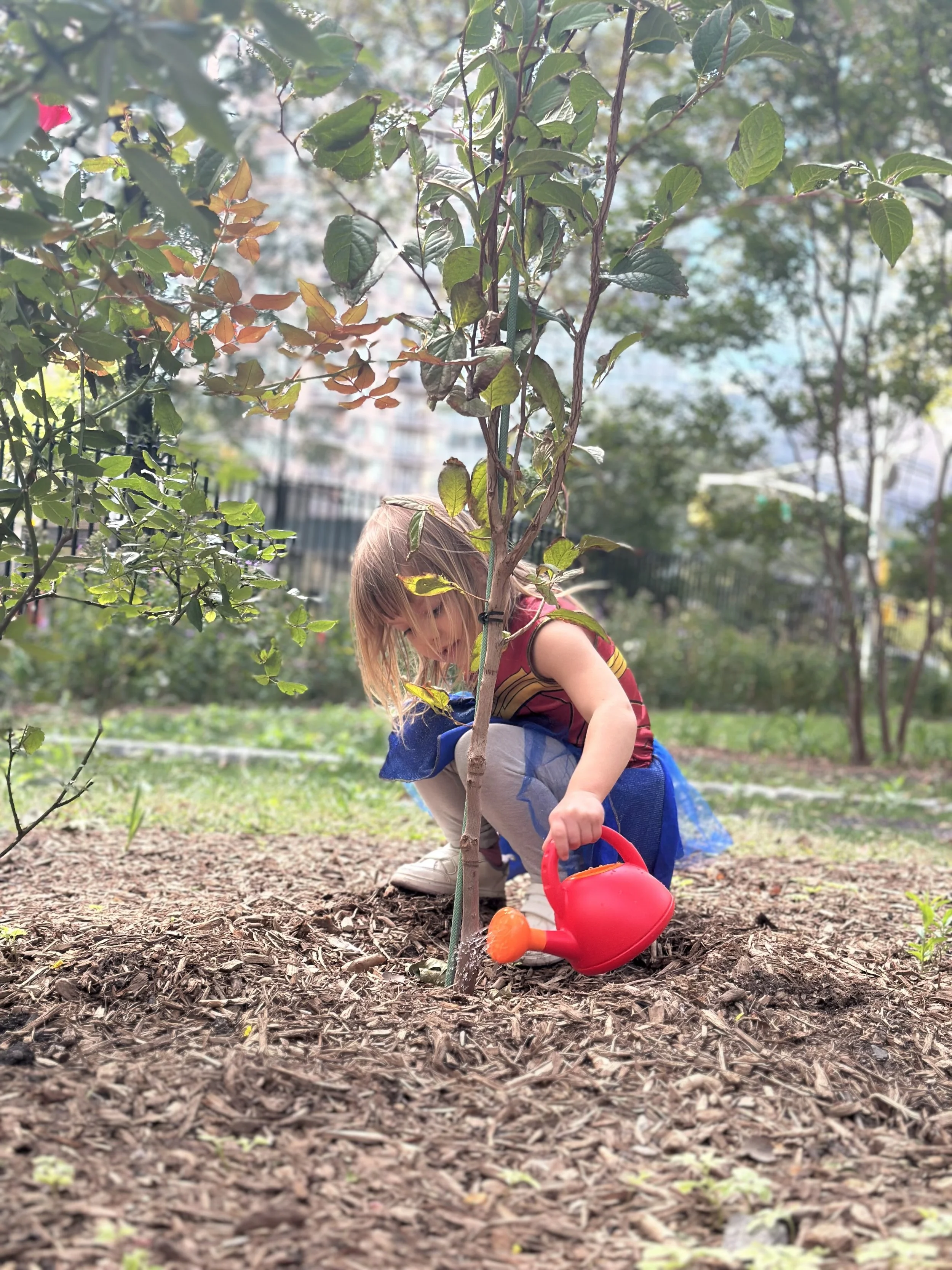 A participant in the program on October 18, 2025, waters one of the St. Vartan Park garden’s two new stewartia trees